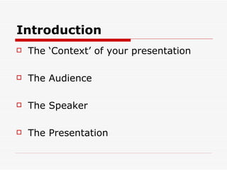The document provides tips for making an effective presentation, including considering the context, audience, and speaker. It emphasizes the importance of preparation, with sections devoted to planning the presentation, developing the content, and rehearsing. Specific tips include having a clear objective, using visual aids to emphasize key points, maintaining eye contact and rapport with the audience, and concluding by summarizing the main messages.