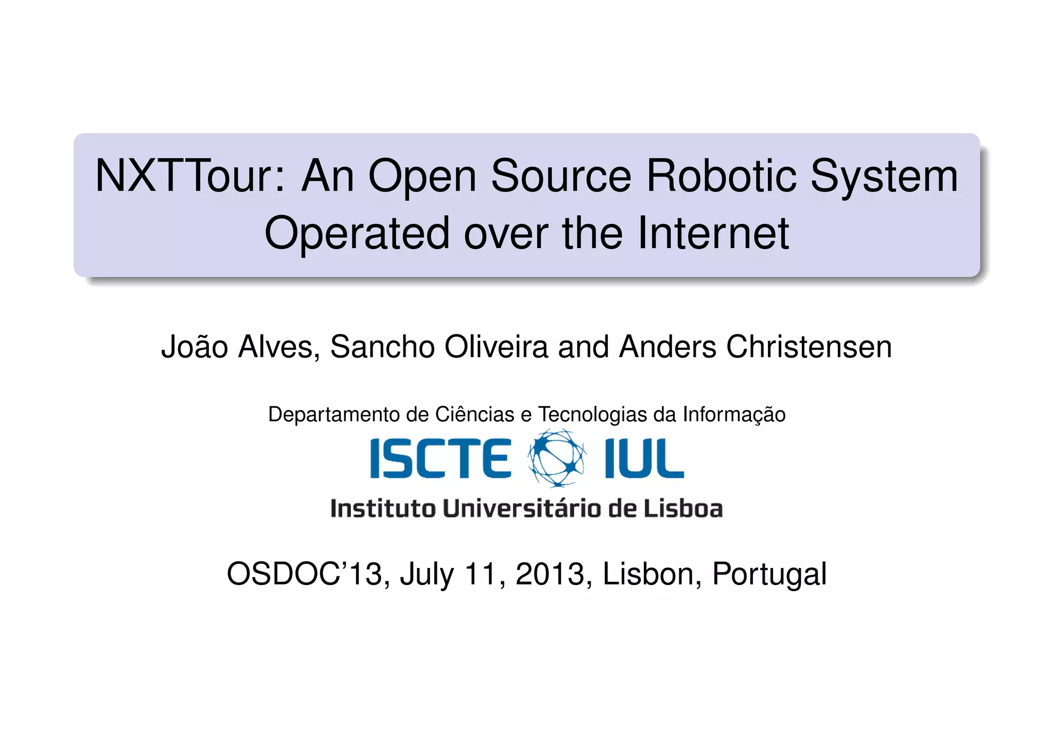 The document presents nxttour, a low-cost robotic system that can be tele-operated over the internet using open-source software and a Lego Mindstorms NXT kit along with an Android smartphone. It details the system prototype, including communication protocols, operational modes, and functionalities such as obstacle avoidance and remote control via a web-based interface. Preliminary experiments demonstrate the system's capabilities and compatibility across various devices and browsers.