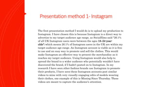The document discusses five presentation methods for a clothing brand: Instagram, merchandise (t-shirts), YouTube, TikTok, and live screenings. Instagram and YouTube were used to promote videos and posters of the brand. T-shirts with the brand logo were produced as merchandise to sell. A live screening with the target demographic provided useful feedback. Overall, the presentations effectively promoted the brand across relevant social media and merchandise in a way typical of online fashion retailers.