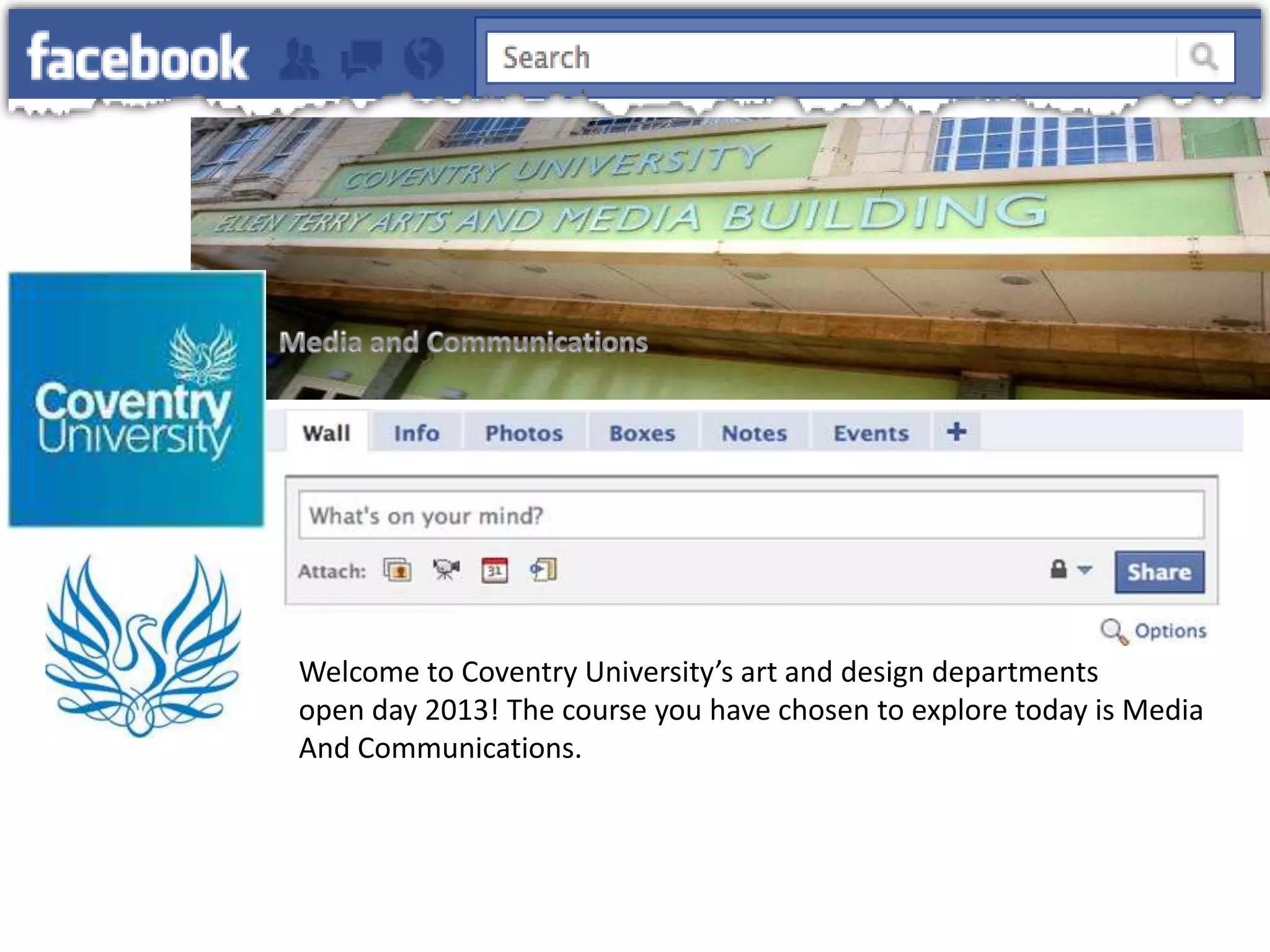 This document welcomes visitors to Coventry University's open day and promotes the Media and Communications course. A current student shares that they have enjoyed regularly updating their blog through the course, which has helped them develop both existing and new skills in an interesting and creative environment. Links are provided to examples of student work.