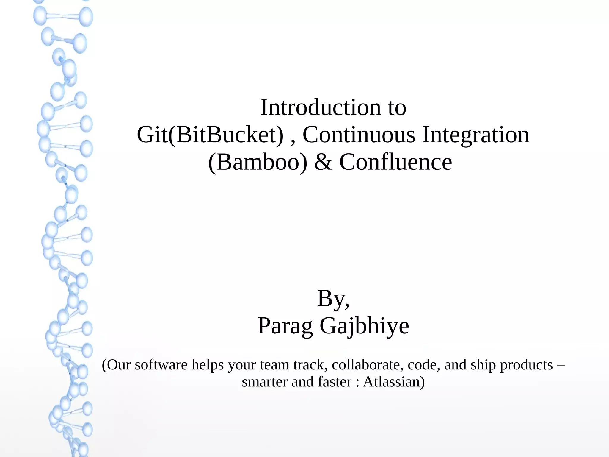 Git is a distributed version control system that allows teams to manage multiple versions of documents and programs. Bitbucket provides Git and Mercurial hosting and integrates with Jira. Continuous integration with Bamboo automates building and testing code changes frequently to catch errors early. Confluence provides a central place for teams to share and collaborate on information.