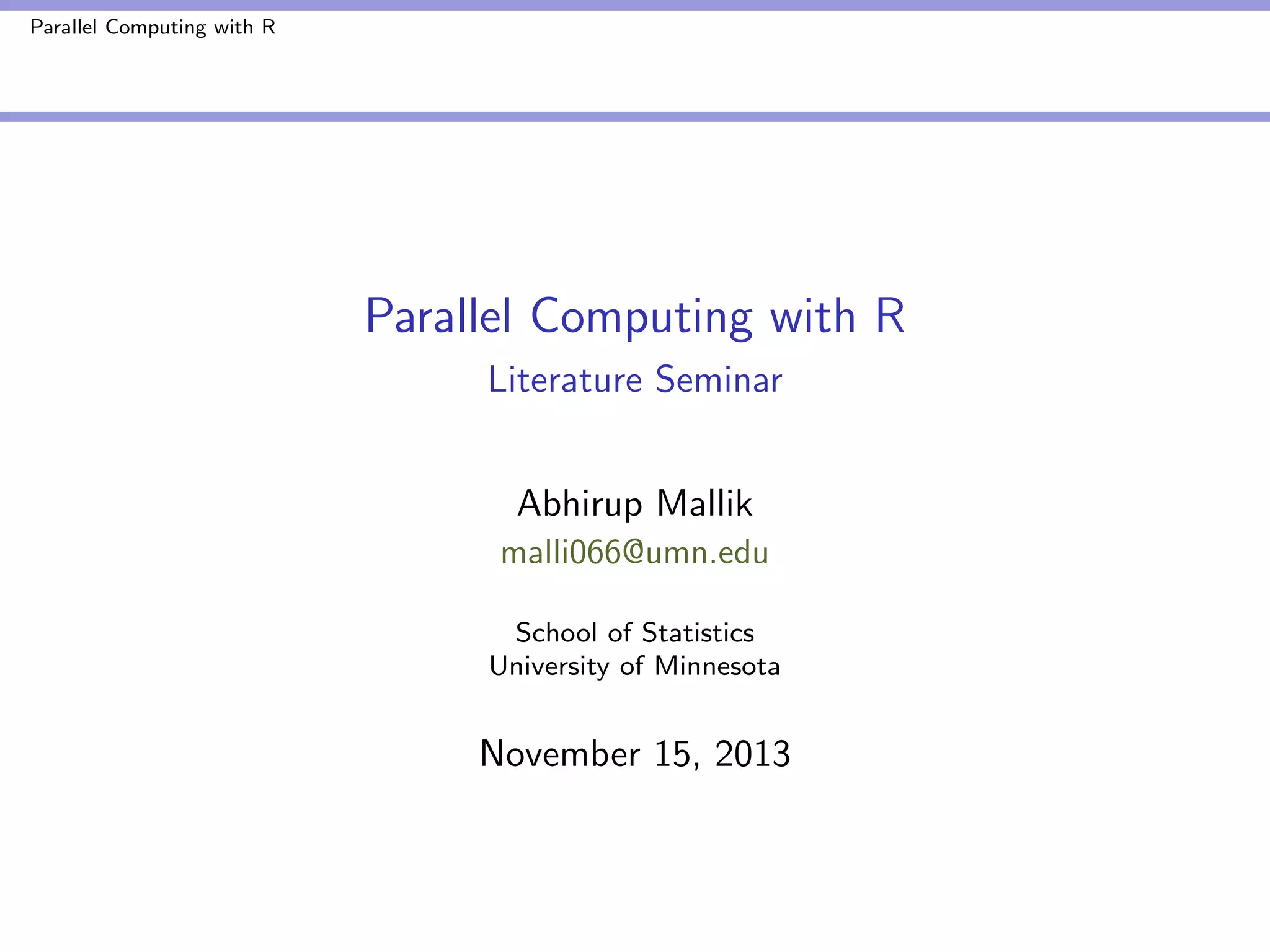 The document covers parallel computing using R, emphasizing its necessity due to R's default limitation in utilizing multiple cores. It details methodologies for implementing parallel computing through libraries like 'parallel' and 'snow', along with examples like cross-validation and cluster creation. Additional resources and code availability are provided at the end of the document.