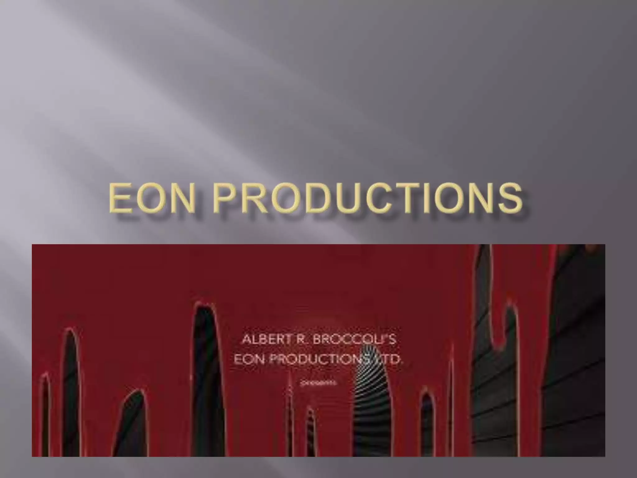 Eon Productions is a film company known for producing the James Bond films. It was started in 1961 by Albert Broccoli and Harry Saltzman. Eon is based in London and operates from Pinewood Studios. The company is owned by Broccoli's family and has produced all official James Bond films except for two exceptions. Eon also holds the copyrights and trademarks for the James Bond film franchise.