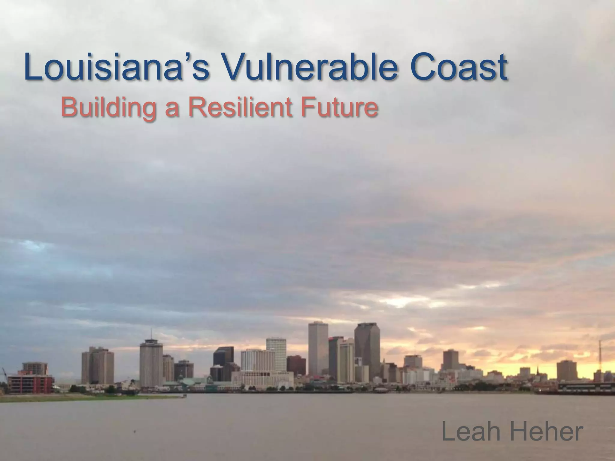 Louisiana's coast is vulnerable to land loss due to factors like levee construction and hurricanes. This has put communities and infrastructure at risk of flooding. Poor and indigenous communities like Isle de Jean Charles face being the first "environmental refugees". The state developed a Master Plan to build flood protection and restore coastal habitats through major projects. Education is needed to increase awareness of the challenges and engage future generations in solutions to create a more resilient coast.