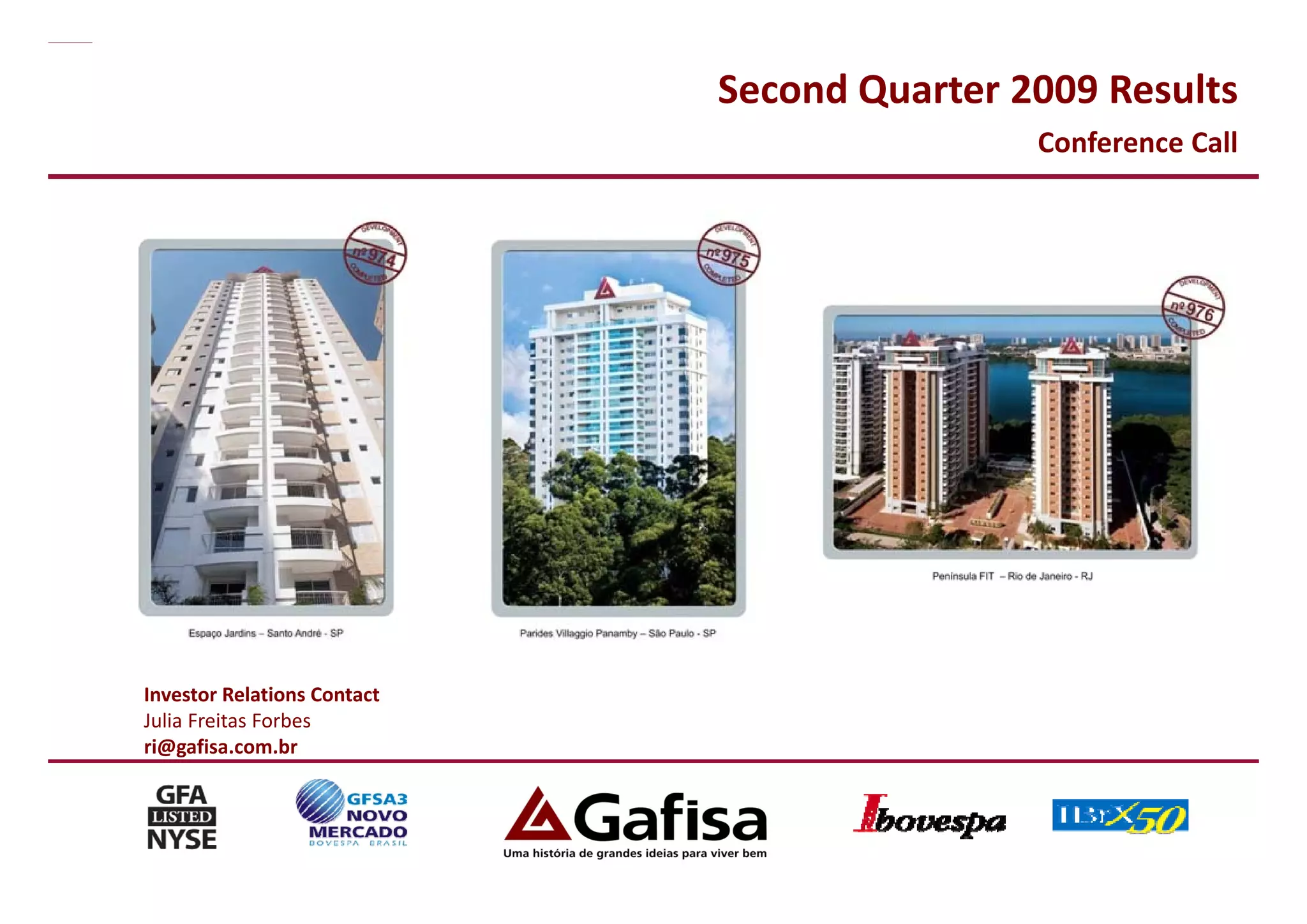 1) Gafisa reported financial results for the second quarter of 2009 with pre-sales increasing 9% compared to the second quarter of 2008 despite a 56% reduction in launches.