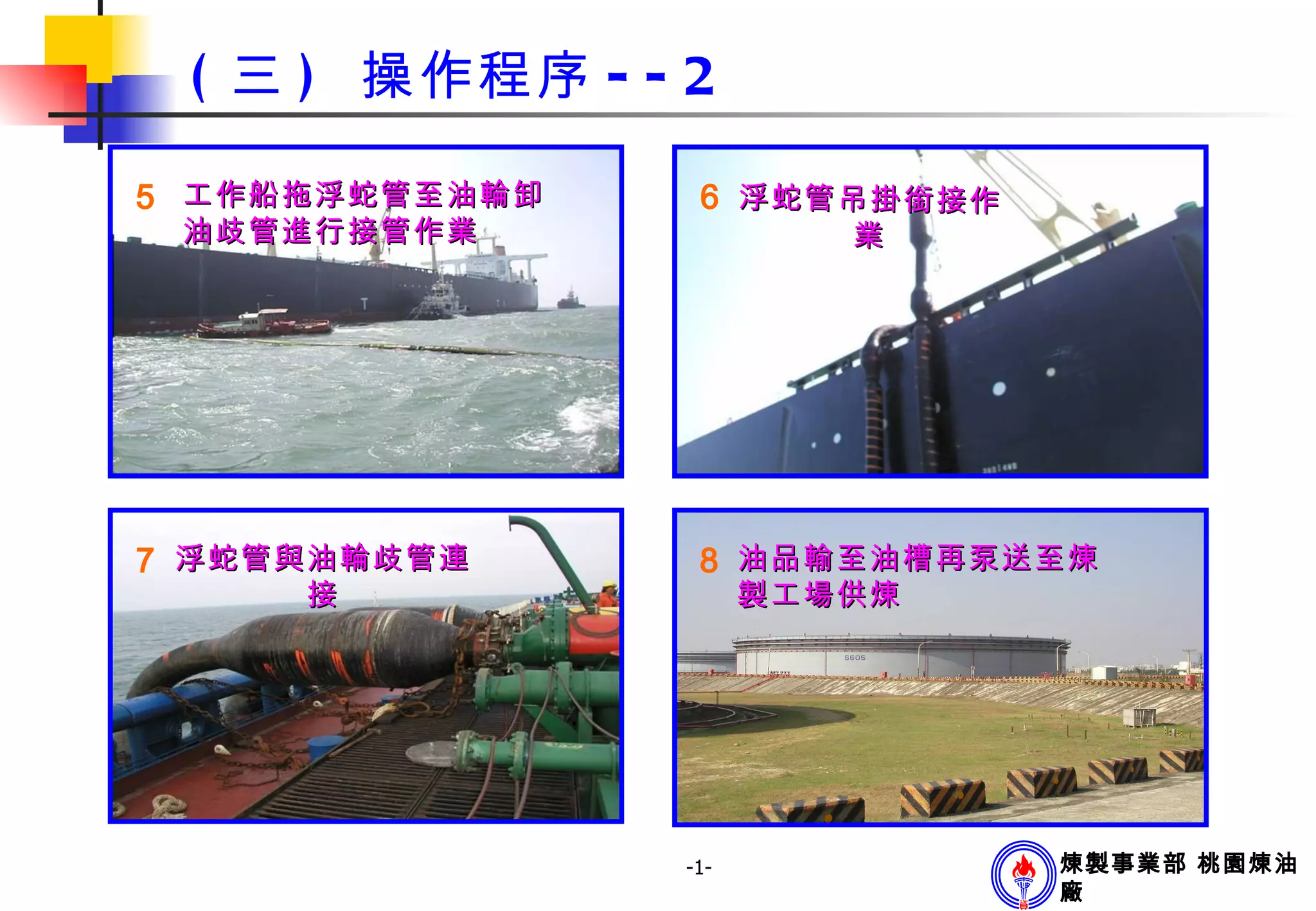 ( 三 ) 操作程序 --2 浮蛇管與油輪歧管連接 5 工作船拖浮蛇管至油輪卸油歧管進行接管作業 6 浮蛇管吊掛銜接作業 7 8 油品輸至油槽再泵送至煉製工場供煉 煉製事業部 桃園煉油廠