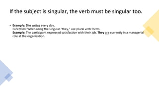 2) Exceptions include using plural verbs with the singular subject "they" and singular verbs when subjects joined by "or" or "nor" are singular.