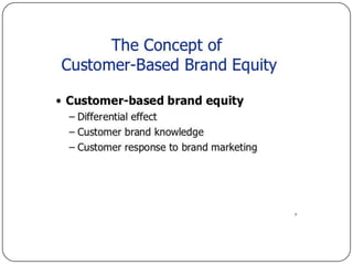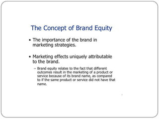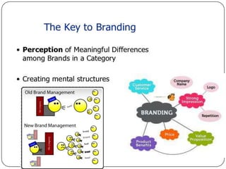 Branding involves giving a product or service a unique name or symbol to identify its source and differentiate it from competitors. Strong brands reduce customer risks and help customers visualize intangible goods. Successful brand management requires analyzing how the brand is positioned in the market and developing good relationships with target audiences. Brands convey attributes, benefits, values, culture, personality and intended users to customers. Branding provides benefits to both buyers through product identification and risk reduction, and sellers through differentiation, market segmentation, and brand loyalty. Common types of brands include manufacturer brands, private brands, and generic brands.