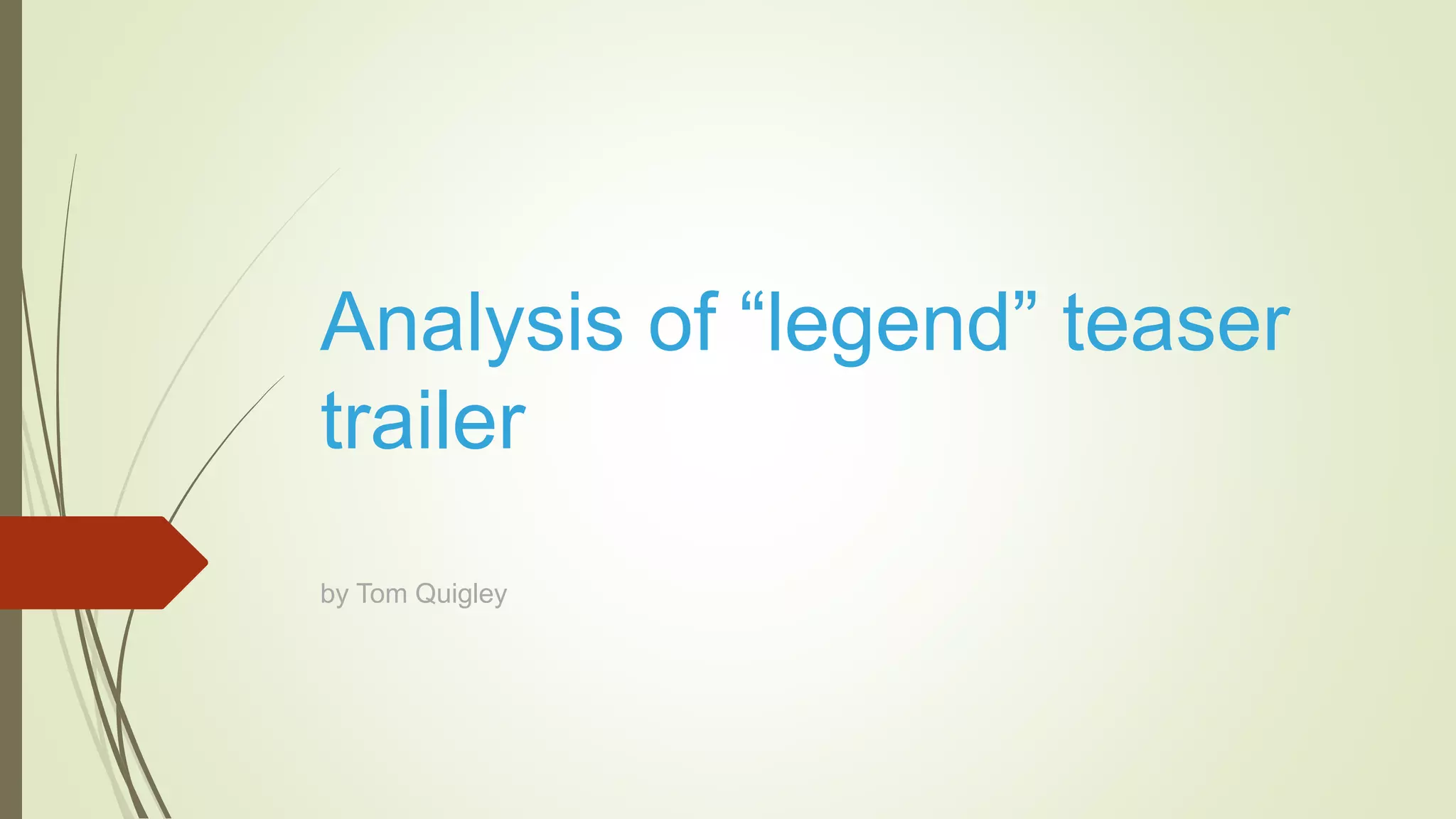 The document provides an analysis of the teaser trailer for the film "Legend". It summarizes that the trailer indicates the film is set in 1950s-1960s London through the costumes and urban environments shown. It analyzes elements of the cinematography including close-ups of the main characters and the use of tracking shots during emotional scenes. The editing uses a montage structure and the pace quickens throughout. The trailer introduces the two main characters, the Kray twins, as powerful crime bosses who aim to rule London through violence and intimidation.