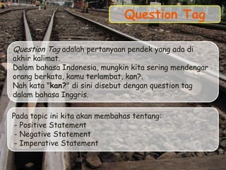 Dokumen ini membahas tentang penggunaan question tag dalam bahasa Inggris, termasuk cara membentuknya untuk positive statement, negative statement, dan imperative statement. Penjelasan mencakup rumus, contoh kalimat, dan catatan penting terkait penggunaan auxiliary verbs dan penyingkatan. Selain itu, dokumen juga menyoroti ellipsis dalam question tag dan cara menjadikannya lebih sopan saat meminta informasi.
