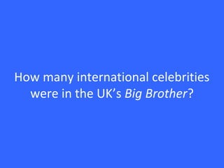 The document contains a series of random questions and answers about television shows and the television industry. It discusses facts around the growth of TV channels in Europe from 40 in 1989 to 1500 by 2002. It also addresses the US share of worldwide TV programming in 2006 as well as details about specific reality TV production companies like Endemol and Fremantle Media and shows they produced including Big Brother, Pop Idol and its variants.