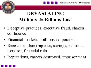 This document discusses numerous corporate scandals and instances of financial misconduct. It lists over 50 companies that have been involved in scandals related to deceptive financial practices, executive fraud, and earnings manipulation. These scandals have led to billions of dollars in losses and economic damage. The document examines common factors like aggressive accounting, weak corporate governance, inflated executive compensation, and permissive cultures that allowed misconduct to occur. Major scandals like Enron, WorldCom, Tyco, and Adelphia are discussed in depth to show how deception and self-dealing led to their falls. Lessons are discussed around improving governance, accounting practices, and prioritizing ethics to prevent future scandals.