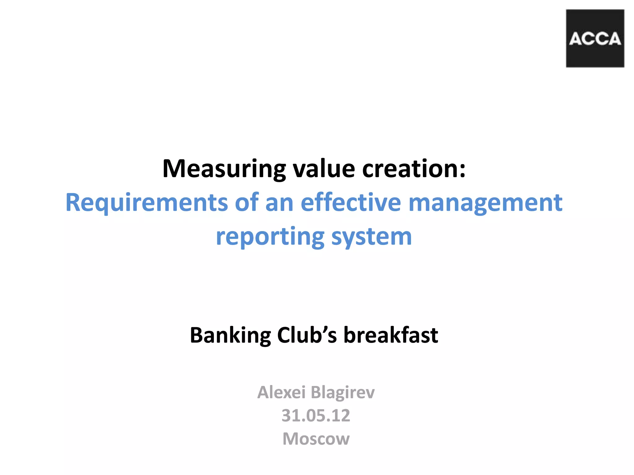 This document discusses effective management reporting systems for banks to measure value creation. It proposes using a value measuring methodology (VMM) with three components: a value structure identifying key areas that create value for customers, society, operations etc.; a cost structure; and a risk structure. Key performance indicators (KPIs) should be linked to key risk indicators (KRIs) to integrate risk and performance management. Appendices provide examples of mapping KRIs against potential impacts; sources of risk and performance; the risk-performance cycle; and how KPIs relate to risk appetite and tolerance. The document advocates a holistic approach linking financial, operational and risk metrics to truly reflect how value is created and destroyed.
