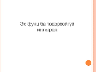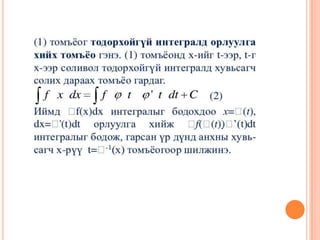 Математикийн шинжлэх ухаанд функцийн уламжлал ба интеграл тооллын асуудлуудыг судалдаг. Функцийн эх функцийг олохдоо тодорхой завсарт f′(x)=f(x) тэнцэтгэл биелж байвал уг функцийг эх функц хэмээн нэрлэдэг. Жишээлбэл, x+6=t бол x=-6 + t, dx=dt юм.