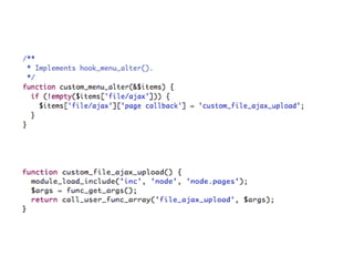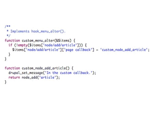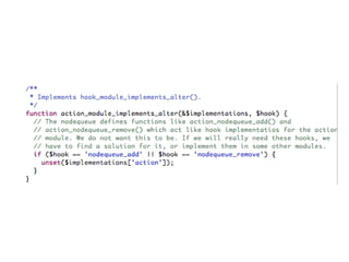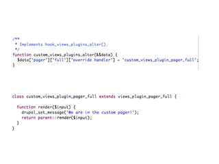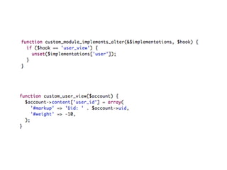 Overwriting code in Drupal allows customizing existing functionality without directly modifying core files. This can be done by altering hooks, extending classes, or overriding routes and services. In Drupal 7, menu items can be overwritten by hook_menu_alter(), views plugins with hook_views_plugins_alter(), and handlers by altering the file registry with hook_registry_files_alter(). In Drupal 8, menu items are altered by modifying routing files, and views plugins and handlers can be customized via alter hooks or changing the cache_views_info table. Overwriting should aim to extend rather than directly copy core code due to upgrade issues.