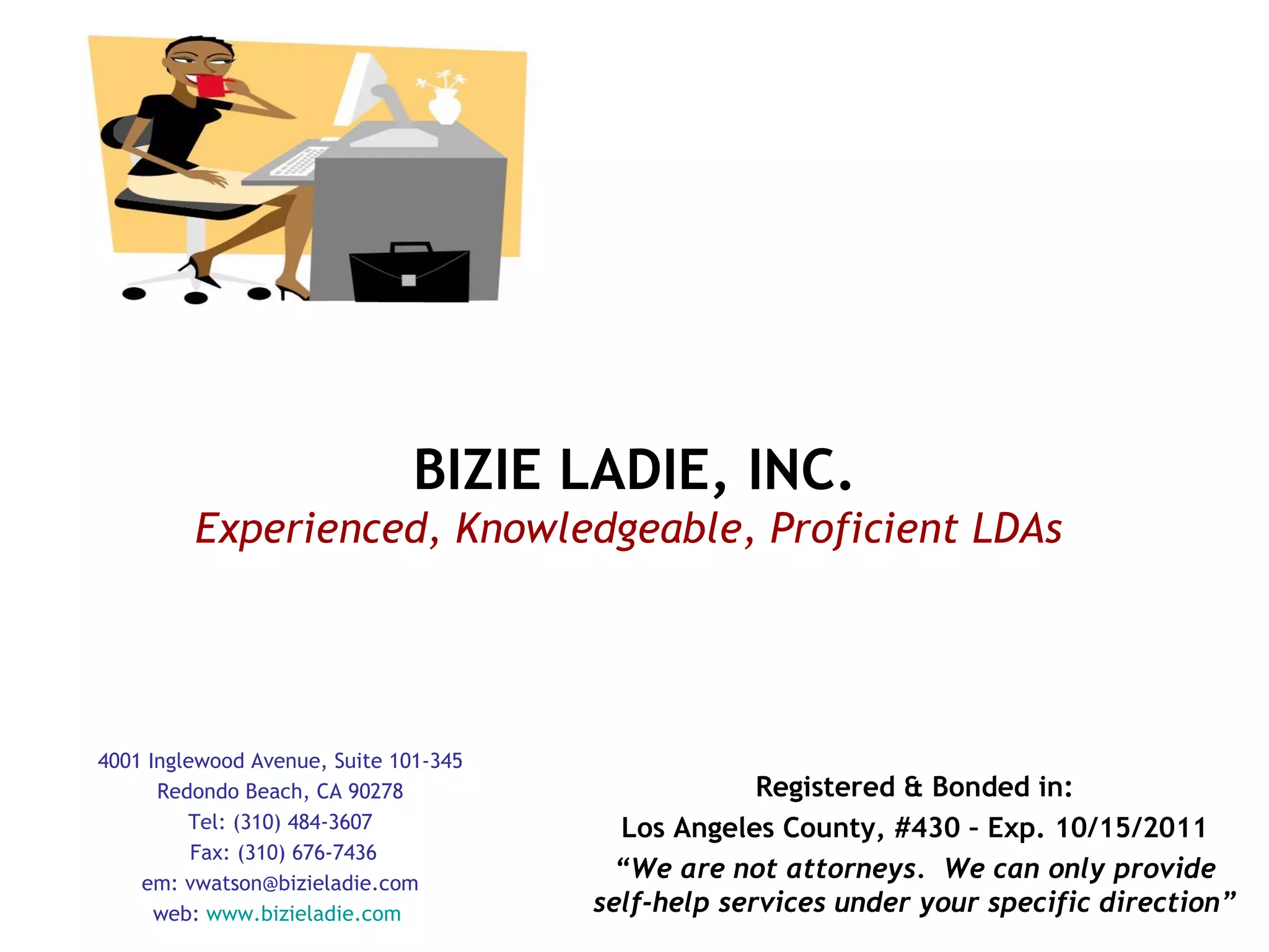 Bizie Ladie, Inc. is a legal document preparation service run by Vanessa Watson that provides legal documents to self-represented individuals. The document discusses what an LDA (Legal Document Assistant) is, the advantages of using an LDA, and how to become an LDA, which involves training, experience, and registering with the county. It also lists some of the legal document preparation services offered by Bizie Ladie, Inc. and their associated prices.
