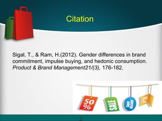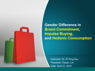 This document summarizes a presentation on a study about gender differences in brand commitment, impulse buying, and hedonic consumption. The study found that women reported higher levels of brand commitment, hedonic consumption, and impulse buying compared to men. This supported all three of the study's hypotheses, which were based on evolutionary explanations of gender differences in personality and previous consumer research. However, the study was limited by only sampling college students in Israel, a fairly westernized nation, so the results may not generalize to other cultures or age groups. Expanding the study to more diverse samples was suggested.