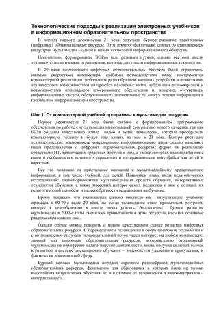 Документ обсуждает развитие интерактивных мультимедийных учебников и электронных образовательных ресурсов (ЭОР) в учебном процессе с начала 21 века, акцентируя внимание на их технологических возможностях и влиянии на обучение. Рассматривается переход от традиционных учебников к интеграции разнообразных мультимедийных и интерактивных элементов в образовательные материалы, а также необходимость создания единой среды для улучшения процесса обучения. Технологии облачных учебников, гиперссылок и новым форматов (PDF и HTML) предлагаются как решение для создания эффективных учебных ресурсов в современных образовательных системах.