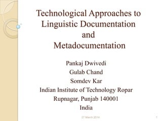 This document discusses technological approaches to linguistic documentation and metadata. It notes that half of the world's languages may disappear in the next few generations if they are not used by children. Both old and new technologies are important, as languages need orthography to function in modern society, but new tools risk lack of sustainability, portability, and compatibility. A balance is needed between portability, sustainability, maintenance, access, and latest tools for recording, analysis, archiving, and sharing language data in formats and platforms that ensure preservation of unique linguistic heritage.