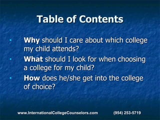 2) What to consider when choosing a college such as academics, finances, housing, activities and safety.