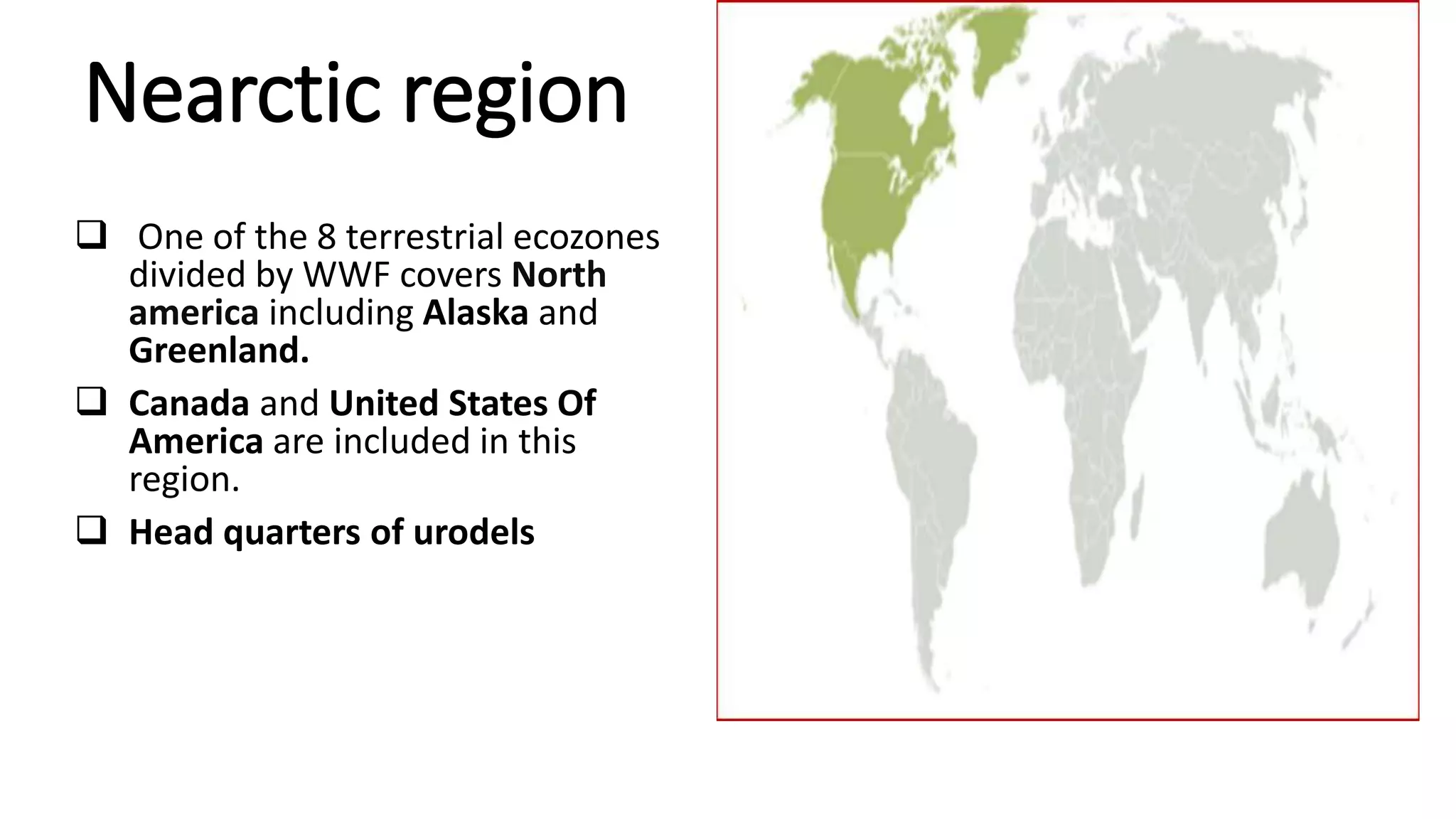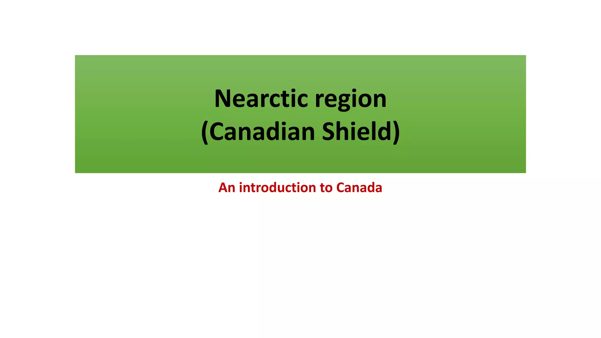 The document provides information about the Nearctic region, which includes North America north of Mexico. It notes that Canada and the United States are within this region. It then discusses the Canadian Shield sub-region, which covers the northern portion of the continent and includes Arctic tundra and boreal forests. It also mentions some of the common animal species found in the Nearctic region.
