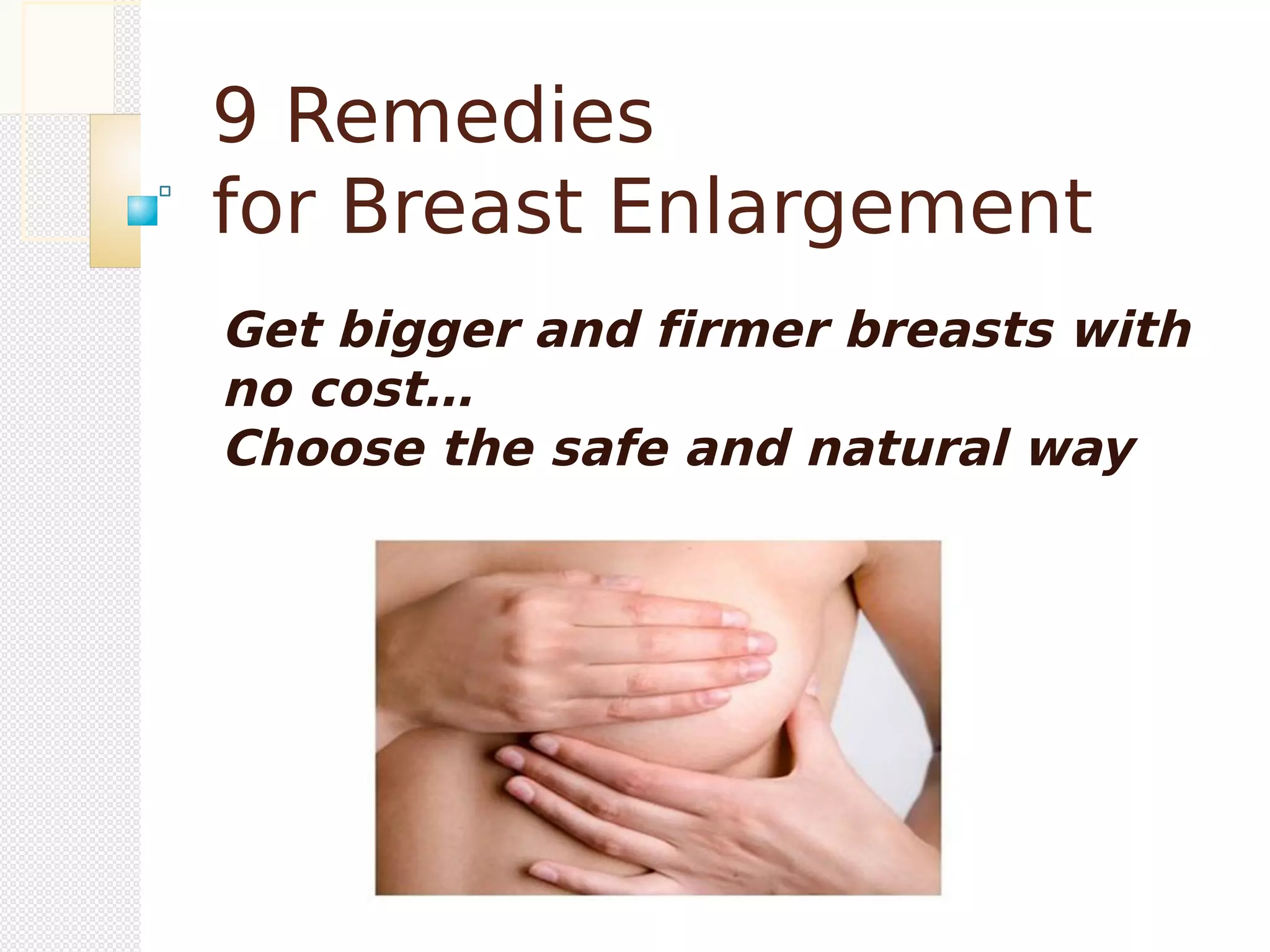 The document outlines nine natural remedies for breast enlargement, including fenugreek, fennel, red clover, wild yam, saw palmetto, black cohosh, licorice, and blessed thistle. It emphasizes safe and natural methods to enhance breast size while providing quick tips for overall health, such as avoiding harmful materials and staying hydrated. Additionally, it hints at the use of herbal supplements for breast enhancement.