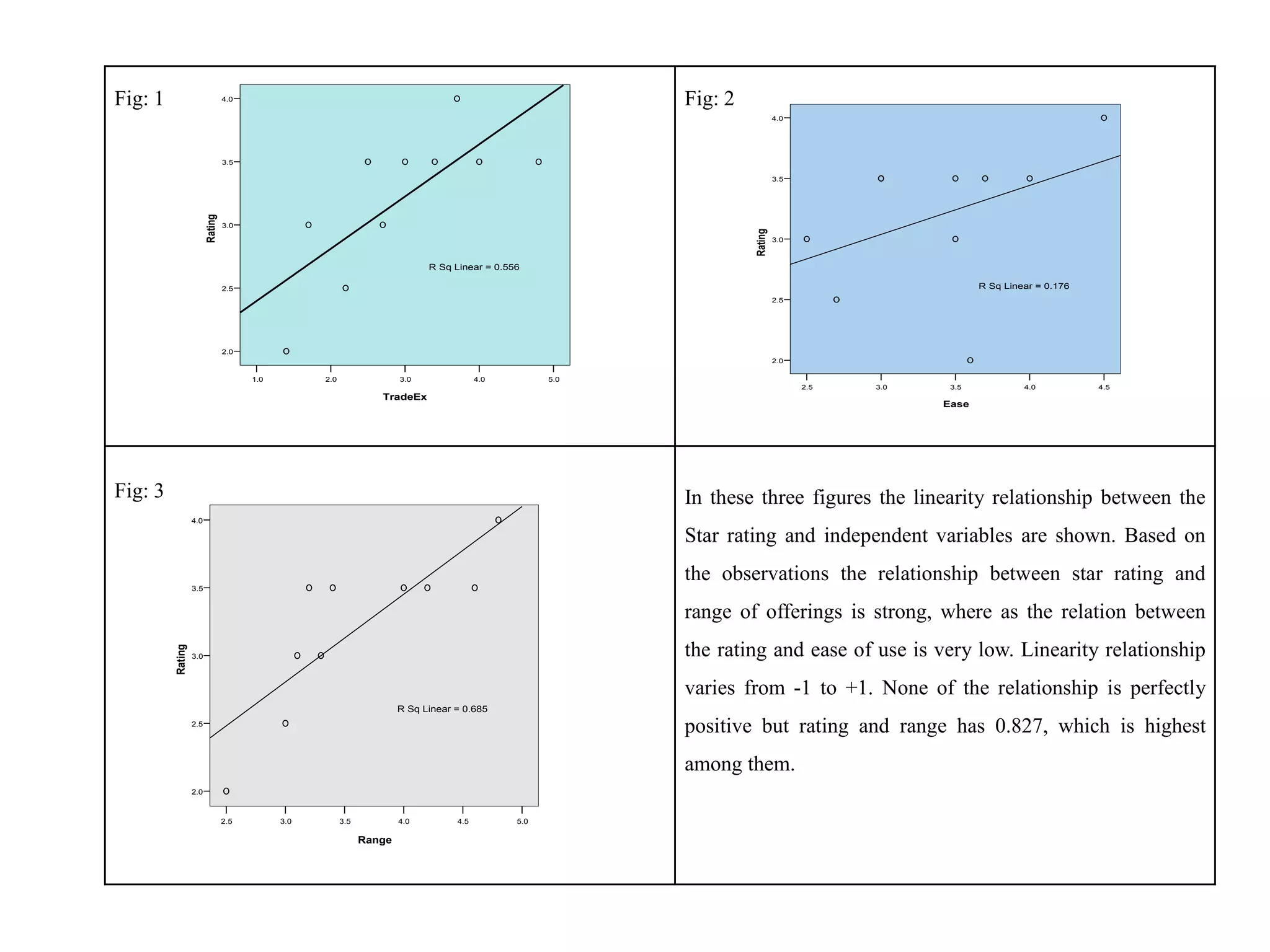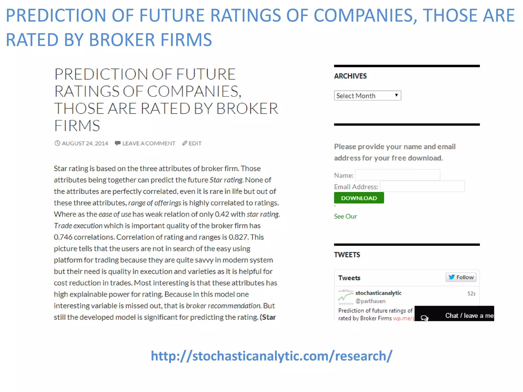 The document describes research on predicting future ratings of companies rated by broker firms. Several regression models are analyzed with the star rating as the dependent variable and variables like trade execution, ease of use, and range of offerings as independent variables. The best-fitting model has an R-squared value of 0.956, indicating it accounts for over 95% of the variation in star ratings. This model relates the square of the star rating to transformed versions of the independent variables.