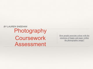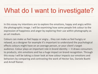 This document discusses an investigation into how color is associated with emotions like happy and angry in photographs. The author will examine works by Hector Sos, Gillian Wearing, and Kyungwoo Chun to analyze how these artists use color in their photos to express emotions. Hector Sos creates paper masks for portraits that use color and paper details to suggest feelings. Gillian Wearing photographs people holding signs with their inner thoughts, using lack of facial expression with messages. Kyungwoo Chun uses blurred portraits and bold colors that the author thinks could emphasize emotions when combined with colored backdrops.