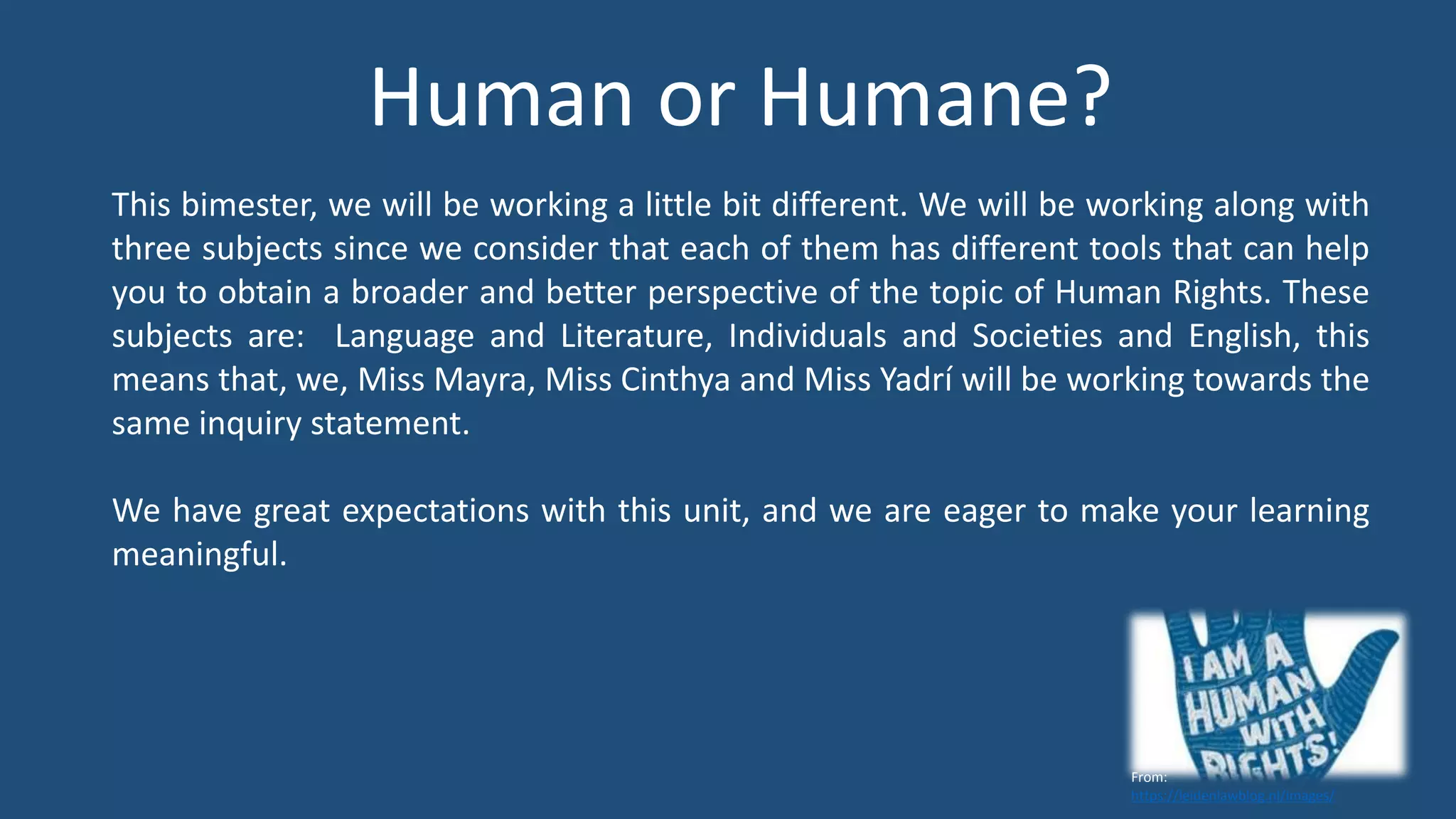 This document outlines an interdisciplinary unit on human rights that incorporates language and literature, individuals and societies, and English. The unit will have students from three subjects working towards the same inquiry statement that human rights arise from global interactions and are essential for equitable living conditions and development. Key concepts like point of view, social interactions, and arguments will be explored. Students will produce an argumentative essay and participate in a Model UN simulation debate that will be evaluated based on indicators from the different subject areas. The goal is for students to gain a broader perspective on human rights.