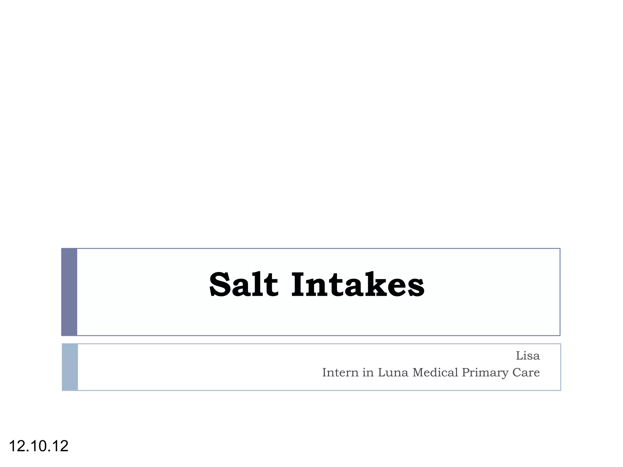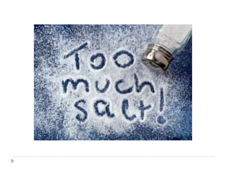 This document discusses salt intake and its sources. The majority (75-80%) of salt intake comes from processed foods like bread, cold cuts, pizza, snacks rather than from table salt. While the adequate daily intake is 1500mg, the average American consumes over 2400mg per day. High salt intake is linked to high blood pressure, heart disease, and stroke. The document recommends reducing salt intake gradually by choosing lower salt options more often to lower health risks.