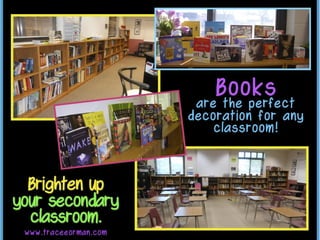 This document provides useful ideas for classroom layout and design to help teacher trainees. It suggests arranging desks in groups to encourage collaboration instead of rows. It also recommends displaying student work and resources around the classroom to create a welcoming environment and reinforce lessons. The document includes a works cited page listing additional resources on classroom organization, teaching techniques, and historical figures.