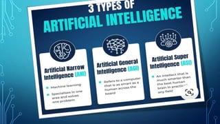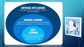 This document presents an overview of artificial intelligence (AI), including its history, applications, and common misconceptions. AI has integrated into daily life through platforms like Google, Facebook, Netflix, and YouTube. It clarifies that AI, machine learning, and deep learning are distinct concepts despite their associated functionalities.