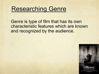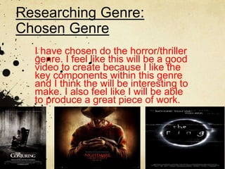 This document discusses researching film genres. It focuses on the horror/thriller genre which the author has chosen for their video project. They feel this genre will be good to create because they like the key components of horror films such as sinister non-diegetic music and think they can produce a great piece of work.