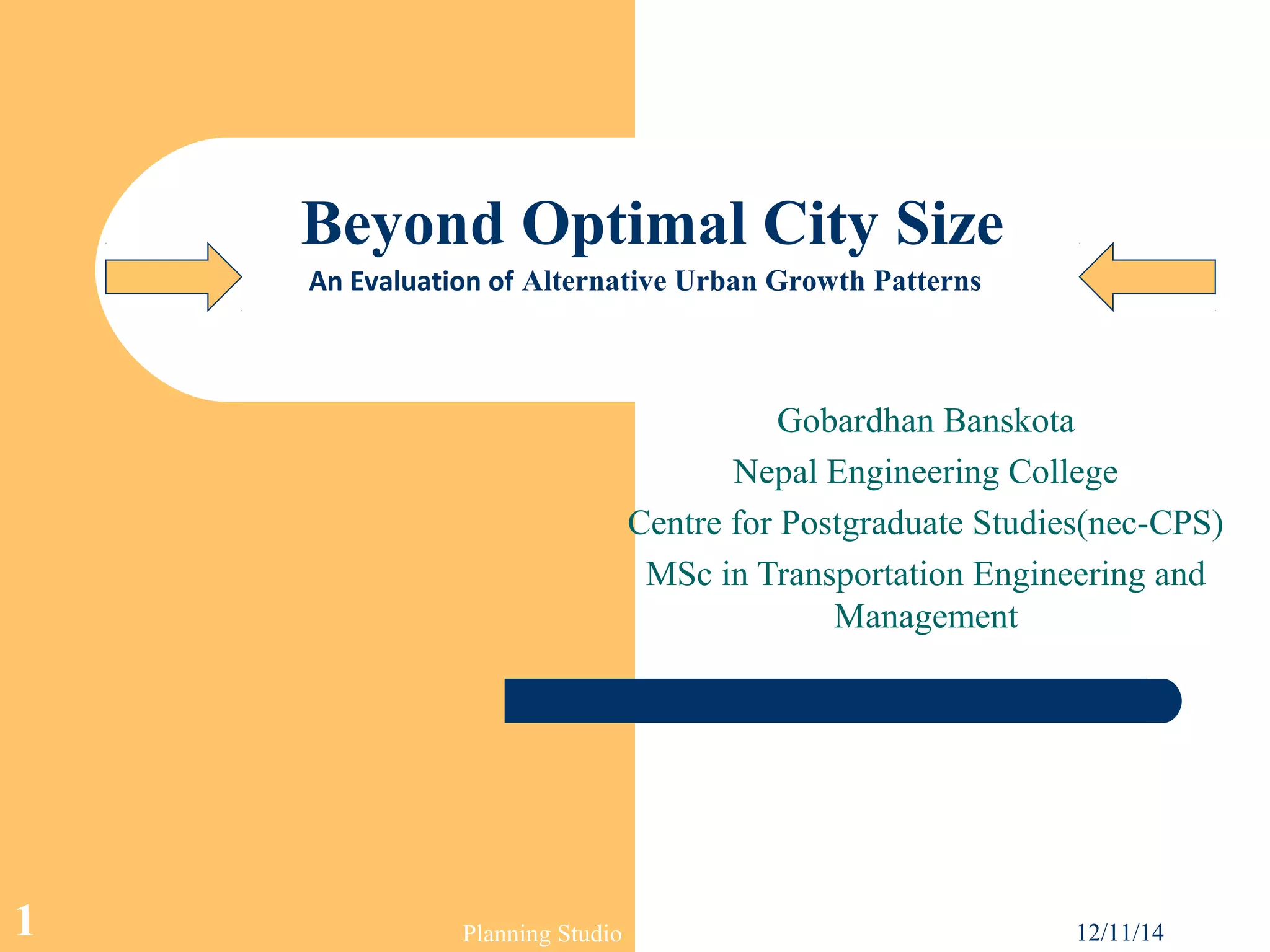 This document summarizes a research paper that evaluates alternative patterns of urban growth beyond the concept of an optimal city size. It begins by introducing the original research and outlines the presentation, which defines key terms and evaluates different theories on determining urban size. The theories discussed include traditional approaches focusing on indivisibilities, costs and facilities, as well as unconventional approaches considering urban functions, networks and form. The evaluation system examines the size elasticity of a city's effect and overload under various circumstances.