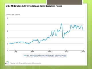 This document discusses forecasting gasoline prices in the United States using an ARIMA model. It provides background on gasoline, including its consumption and retail prices. The objective is to understand price volatility due to supply and demand constraints. Data on US gasoline prices from 1993-2014 is obtained from the EIA. After checking for stationarity and transforming the data, an ARIMA(1,1,3) model is identified as best. This model reveals gasoline prices are significantly related to past prices and unobserved factors. The validated model is used to forecast future gasoline prices.