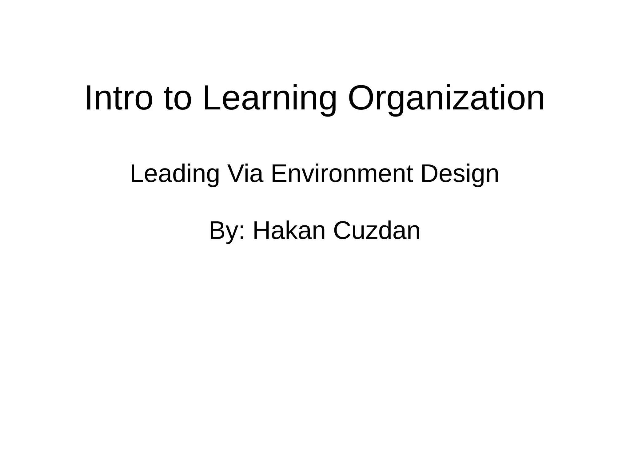 The document outlines exercises aimed at fostering a learning organization through environment design and understanding business models. It encourages participants to reflect on their roles, assess commitment to the business model, and examine workplace culture. Key themes include improvement suggestions, leadership balance, and the importance of collaboration within teams.