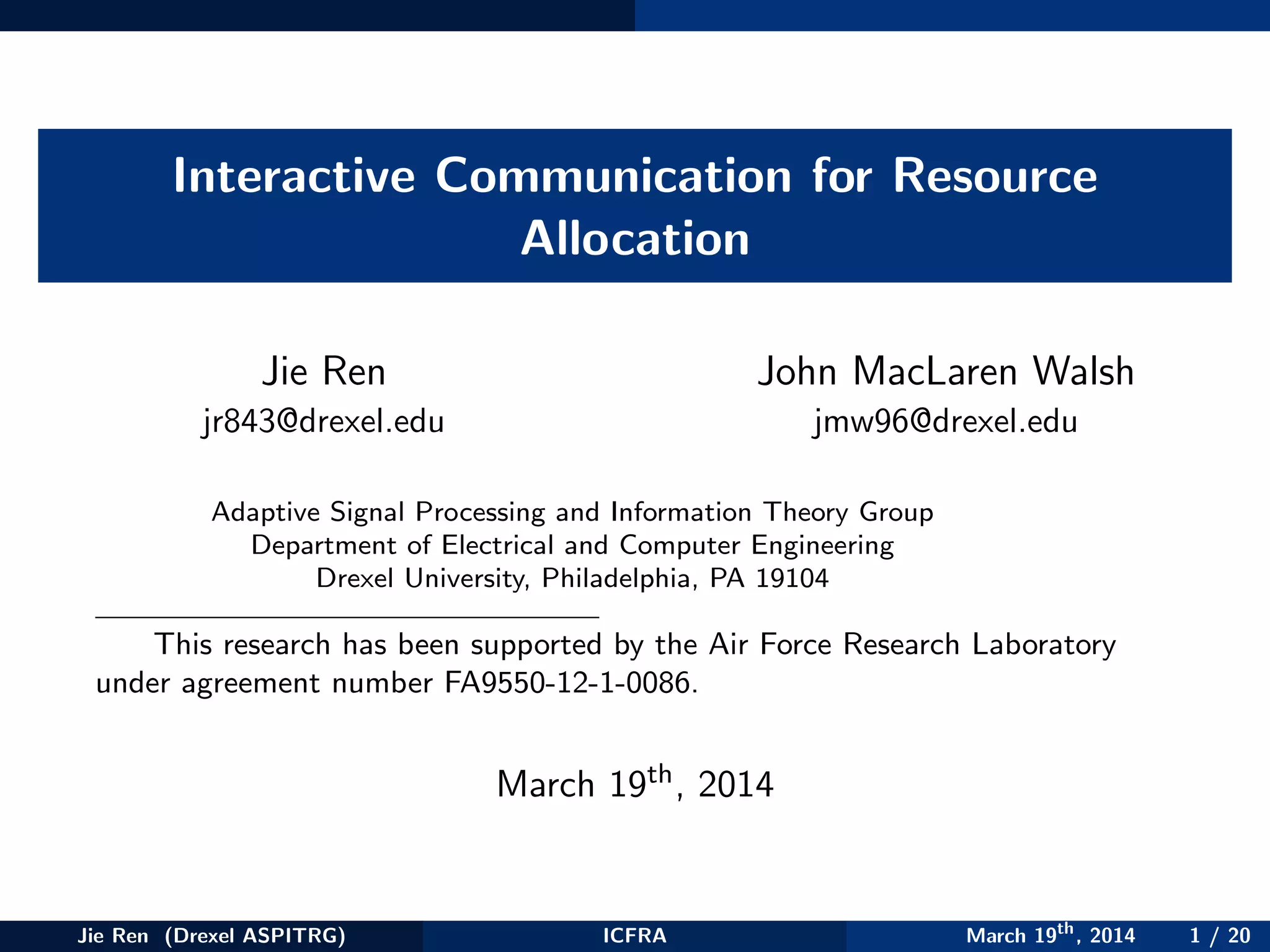 This document presents a scheme for interactive communication between a base station and mobile stations to efficiently allocate resources. It models the problem and analyzes an approach where the base station broadcasts a threshold and mobile stations reply to indicate if their value is above or below it. Through multiple rounds of interaction, the base station can determine the mobile station with the maximum value with significantly less overhead than non-interactive schemes. Simulation results show the proposed approach of encoding the threshold or number of users at each round performs better than baselines. Extensions consider incorporating distortion and trading off communication costs versus time.