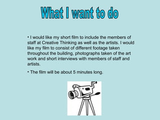 The document outlines a plan to create a 5-minute promotional film for a new building. It will include footage and photographs throughout the building, interviews with staff and artists, and will be edited together with unnecessary parts removed. Once complete, the film will be used to promote the building and Creative Thinking by posting on their website and Facebook page.