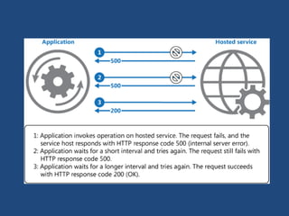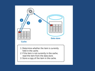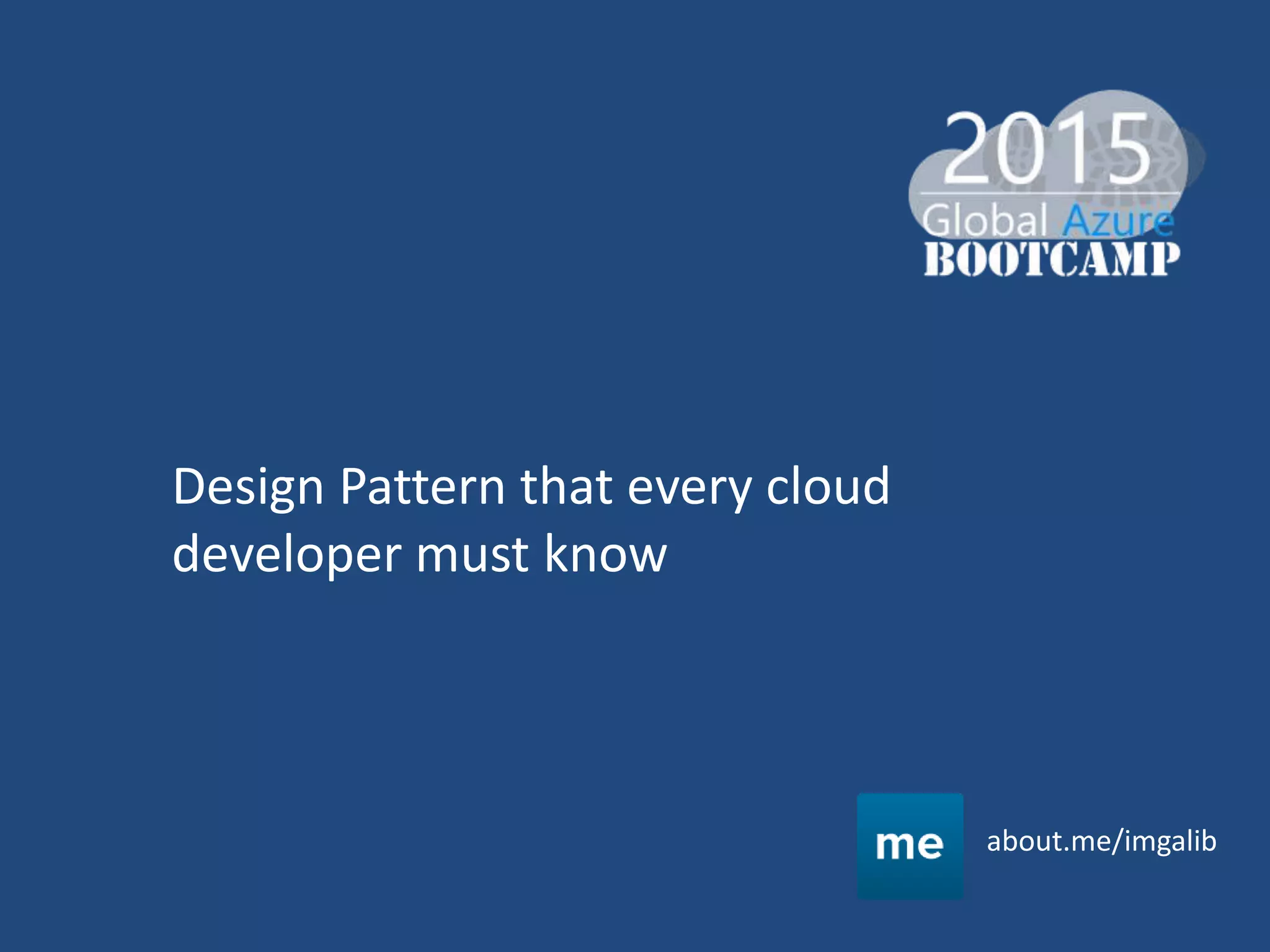 This document discusses design patterns that are useful for cloud-hosted applications. It outlines 24 common patterns organized into 8 categories related to availability, data management, design and implementation, messaging, monitoring, performance, resiliency, and security. The document focuses on the cache-aside and static content hosting patterns for data services, and the retry and materialized view patterns. It provides brief descriptions of when and how to use each pattern with examples of implementing them on the Azure cloud platform.