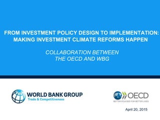 The document discusses the collaboration between the OECD and the World Bank Group (WBG) to improve investment climates through policy frameworks, investment reviews, and regional cooperation. It emphasizes the importance of connecting domestic and foreign investments, tailoring policies to different investment types, and leveraging international agreements for implementation. The ultimate goal is to catalyze reforms that enhance business competitiveness and job creation across various regions.