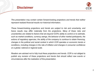 - CCR reported financial results for the fourth quarter and full year of 2012, with net revenue growth of 15.2% and 13.5% respectively compared to the same periods of 2011.