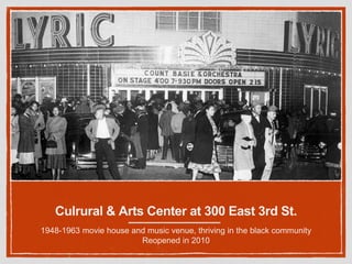 The Lyric Theatre is a cultural and arts center located in Lexington, Kentucky that aims to preserve, promote, and present African American culture. It originally opened in 1948 as a movie house and music venue that served the black community. After closing in 1963, it reopened in 2010 and now hosts live shows, radio programs, summer programs, community outreach, and tours. The summary analyzes the Lyric's use of social media including Facebook, Twitter, and its website to promote events.