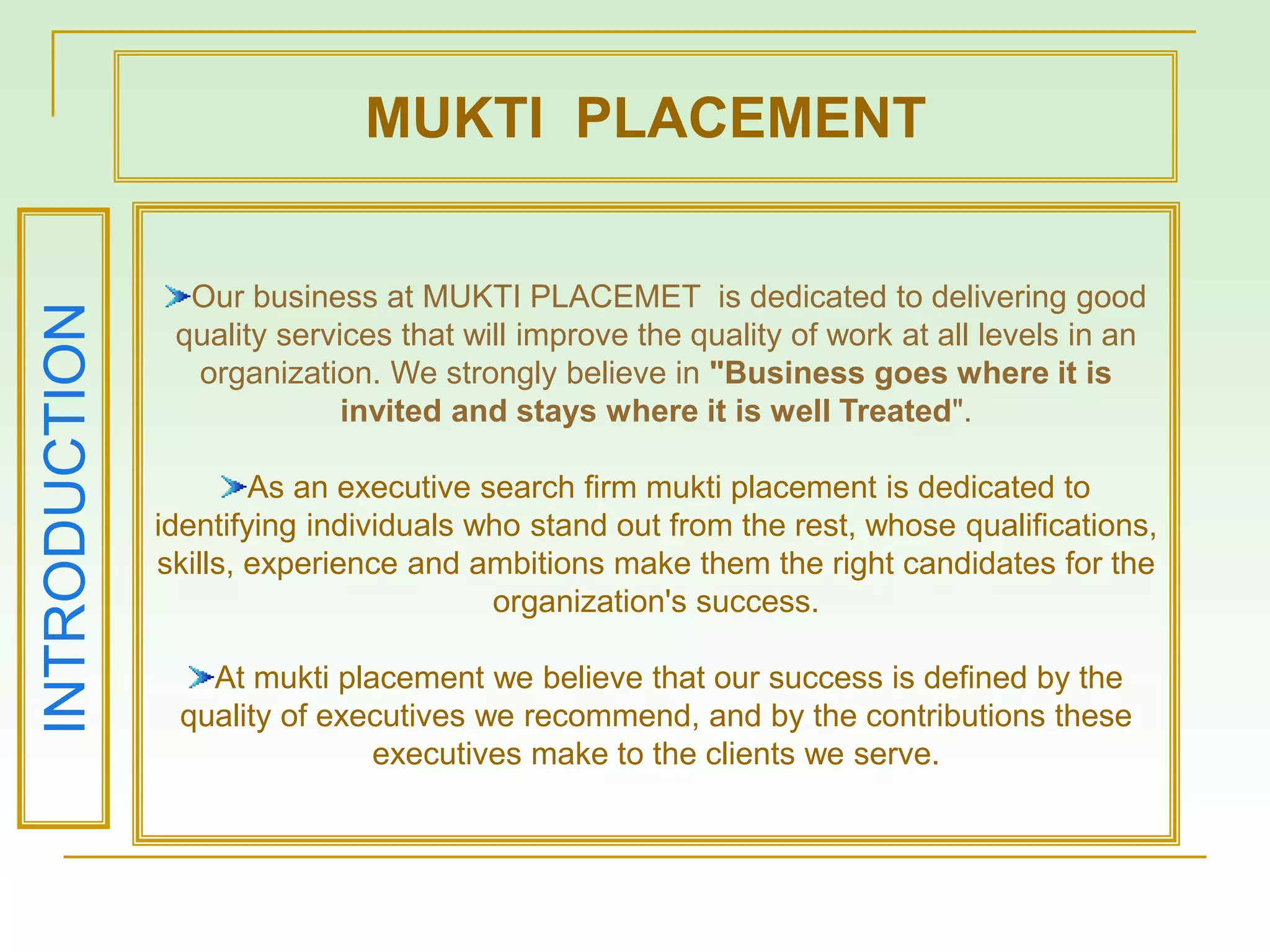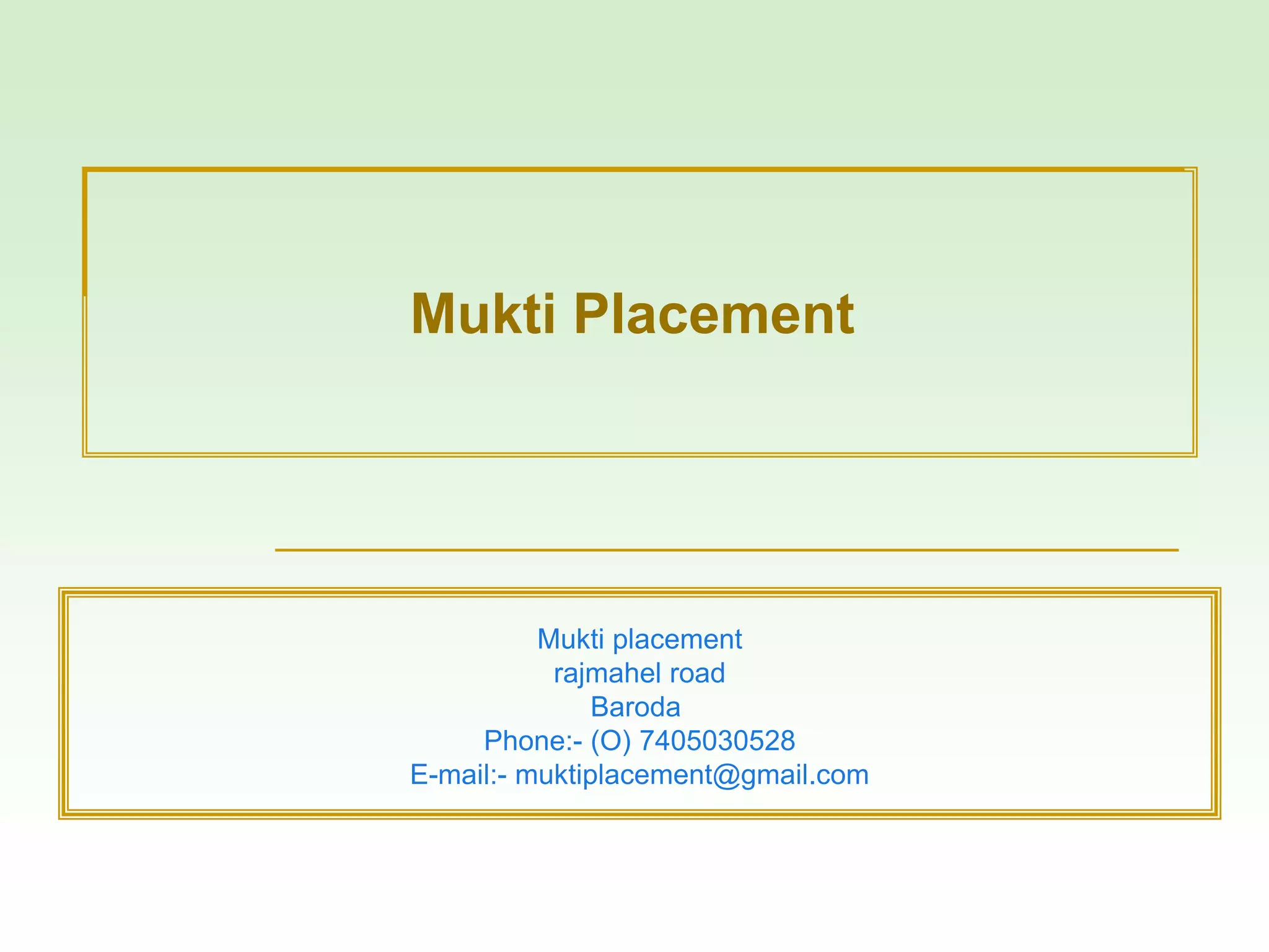 Mukti Placement is an executive search firm located in Baroda, India that identifies qualified candidates for organizations. It deals with industries like manufacturing, pharmaceuticals, chemicals, engineering, automobiles, and power. The firm believes in clarity of requirements, targeted industries, competency mapping, and cultural fitment. It has experienced professionals and promises to work closely with clients, provide expertise, execute assignments diligently, check candidates thoroughly, treat all respectfully, and provide guarantees. Mukti Placement aims to help clients find suitable candidates, develop them, and retain them through comprehensive recruitment solutions.