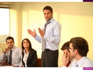 A presentation involves communicating information to a group through speaking. It involves choosing a topic, gathering information, organizing it, and adding visual aids like pictures. An effective presentation structure includes a title slide, content slides with explanations for each topic, and a conclusion slide. Visual aids can make the presentation more interesting but too many can distract the audience. Presenters should introduce themselves, speak from one area, use gestures, speak clearly, and end confidently. Nervousness is common when presenting, but preparing well and having confidence in oneself can help manage it. The document provides tips for preparing and delivering an effective presentation.