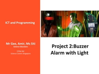 This document provides instructions for a project to build an alarm with light using an Arduino. The project will teach students to use an Arduino to produce light with an LED and sound with a buzzer. It includes a sample Arduino sketch that uses digitalWrite to turn the LED on and off and the tone function to play tones of different frequencies on the buzzer. Students are asked to modify values in the sketch to change the tones and explore the relationship between frequency and sound.