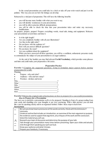 The document provides guidance on how to give a successful presentation. It emphasizes that preparation is key and involves understanding the audience, having a clear objective, developing an organized structure, and rehearsing. The introduction should grab the audience's attention, state the presentation topics and structure, and set expectations. The body should present the topics in a logical order while engaging the audience. The conclusion should summarize the main points and invite questions. Thorough preparation through outlining, researching, rehearsing, and refining visual aids and timing will result in a confident delivery and effective communication with the audience.