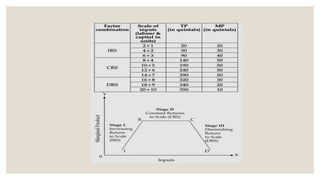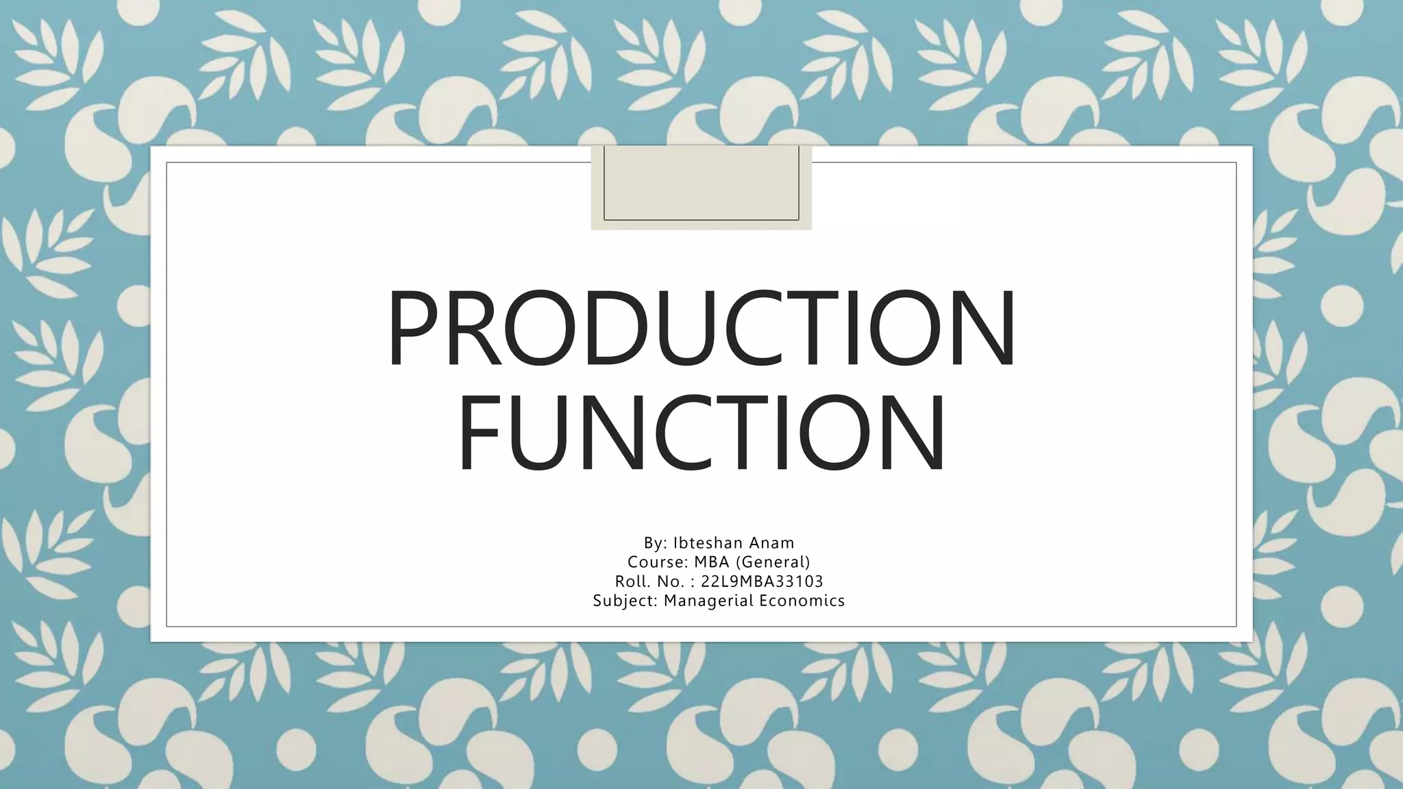 The production function explains the relationship between inputs and output in economics. There are four main factors of production: land, labor, capital, and entrepreneurship. These can be fixed or variable factors. The production function formula is Q=f(K,L) where Q is output and K and L represent capital and labor. There are short-run and long-run production functions depending on whether inputs are fixed or variable. The law of variable proportions describes how marginal product decreases as the variable input increases in three stages: increasing, diminishing, and negative returns. Returns to scale refers to the proportional change in output from a proportional change in all inputs and can be increasing, constant, or diminishing.