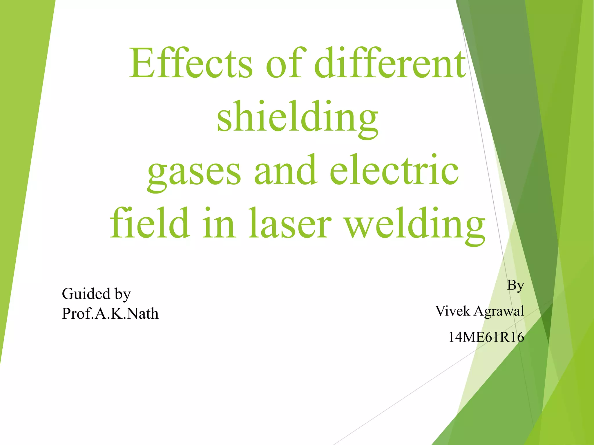 This document summarizes research on the effects of different shielding gases and electric fields on laser welding. It discusses how plasma forms during laser welding and can absorb and scatter the laser beam, reducing welding efficiency. The author conducted experiments using different shielding gases and applying electric fields to determine their effects on weld bead formation and address how plasma impacts the laser coupling. Literature on plasma modeling and methods to control plasma like side jets, magnetic fields, and sub-atmospheric pressures is also reviewed.