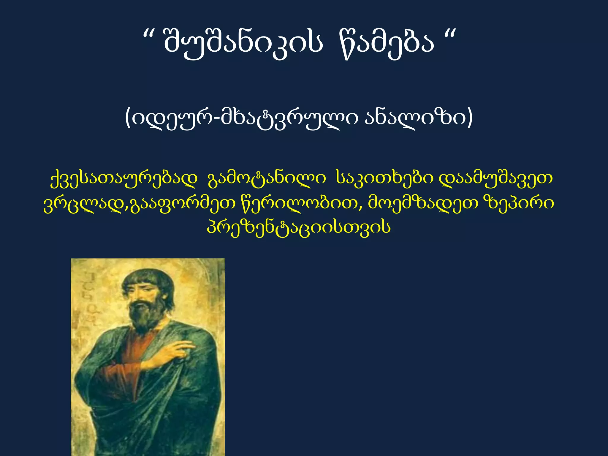 ეს რესურსი მოვამზადე შესასწავლი საკითხების უკეთესად გააზრების მიზნით. თემა გავანაწილე ქვესათაურებად და ,თავისუფალი არჩევანის წესით,მოსწავლეებმა მოამზადეს პრეზენტაციები, ხოლო შემდეგ გაიმართა დისკუსია -"არის თუ არა "შუშანიკის წამება" მხატვრული ნაწარმოები".ვთვლი, რომ ფუჭად არ მიშრომია.
