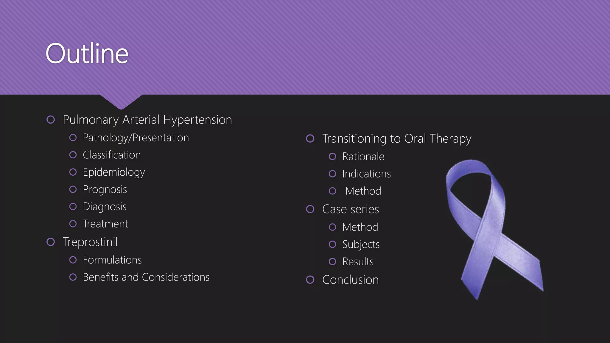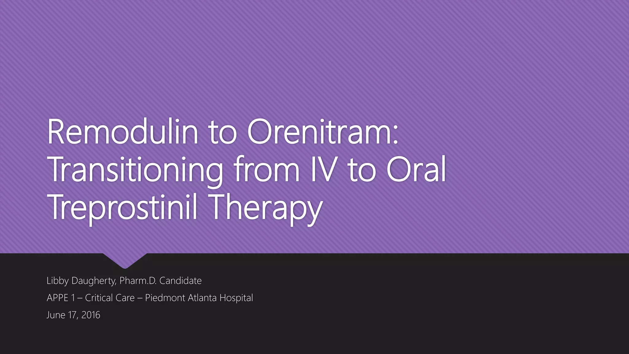 This document provides an outline and overview of transitioning patients from intravenous or inhaled treprostinil (Remodulin) therapy to oral treprostinil (Orenitram) therapy for pulmonary arterial hypertension. It describes a case series that rapidly transitioned 9 stable PAH patients from their current treprostinil treatment to oral Orenitram over 4 days. The results found that the transition was effective for most patients, though 2 required returning to their original therapy due to worsening symptoms.
